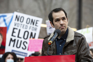 Ezra Levin participates in a rally outside the Consumer Financial Protection Bureau (CFPB) headquarters after it was shut down, on Feb. 10, 2025, in Washington. Mr. Levin’s organization, Indivisible, is calling for new Democratic leadership in the Senate.