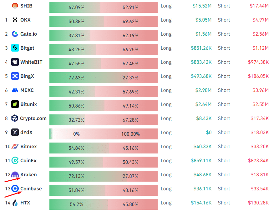 On Kraken, 72.13% of traders are bullish, while 27.87% remain bearish. Meanwhile, Coinbase shows a more balanced sentiment, with 51.48% of traders bullish and 48.16% bearish.